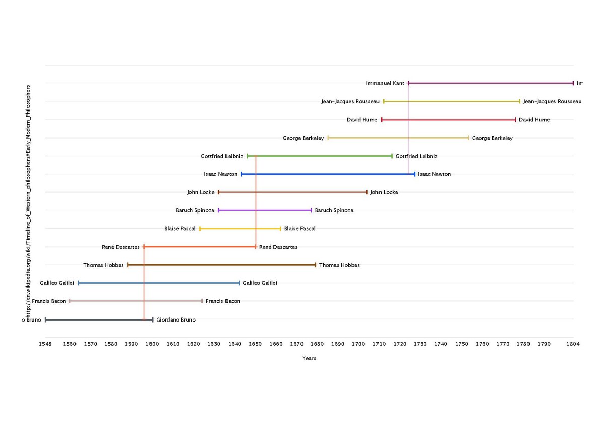 17세기와 18세기의 심리 철학, 인식론, 형이상학의 주요 인물은 크게 두 그룹으로 나뉜다. “합리론자“는, 대부분 프랑스와 독일에서, 모든 지식은 어떤 선천적 관념으로부터 시작한다고 주장하였다. 주요한 관념론자는 데카르트, 스피노자, 라이프니츠, 말브랑슈이다. 반면에 “경험론자“는 지식은 감각적 경험에서 시작한다고 주장하였다. 로크, 버클리, 흄이 이러한 생각을 가진 주요한 인물이다. (이는 칸트에 그 원인이 있는 회귀적인 분류이다.) 이들 철학자가 모두 윤리학에 종사하였음에도 윤리학과 정치 철학은 이러한 분류에 포괄되지 않는다. 정치 철학에서 중요한 다른 인물은 홉스, 루소가 있다.