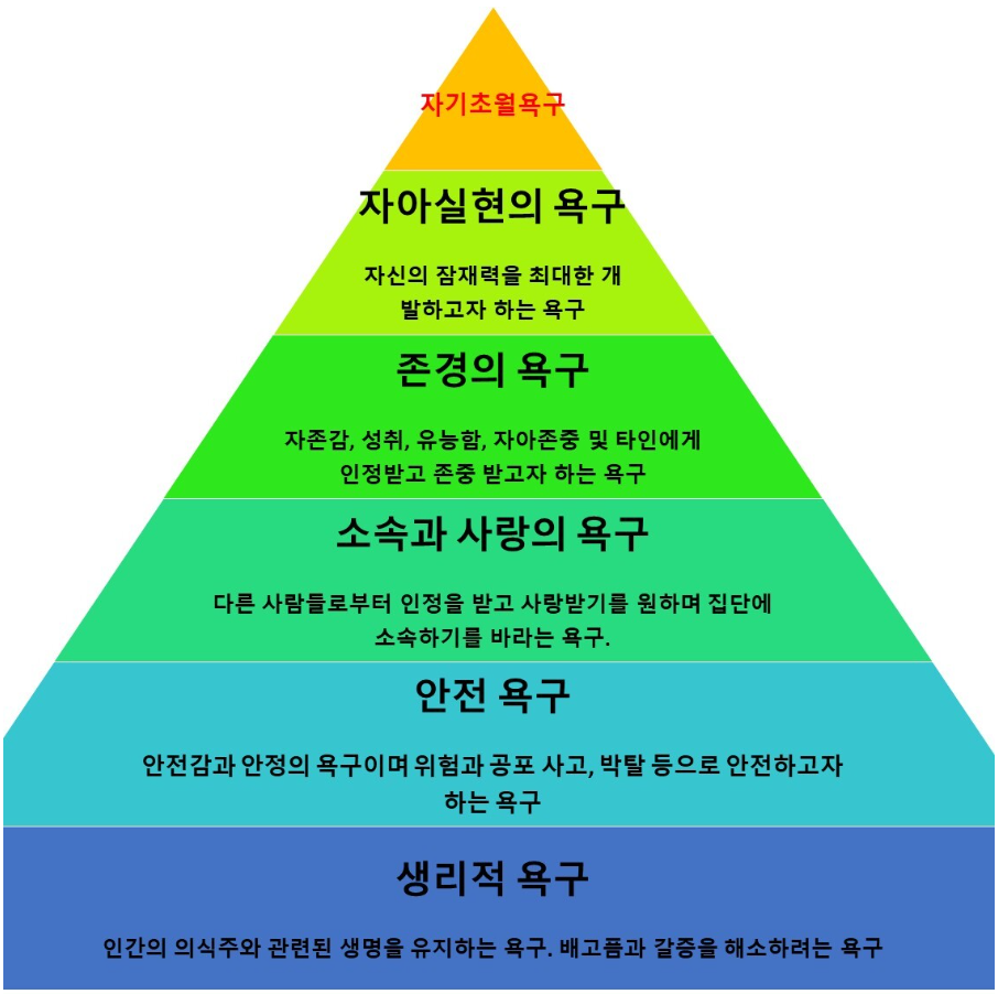 - 자신의 잠재력과 가치를 최대한 발휘하여 자신이 원하는 모습이 되고자 하는 욕구입니다.