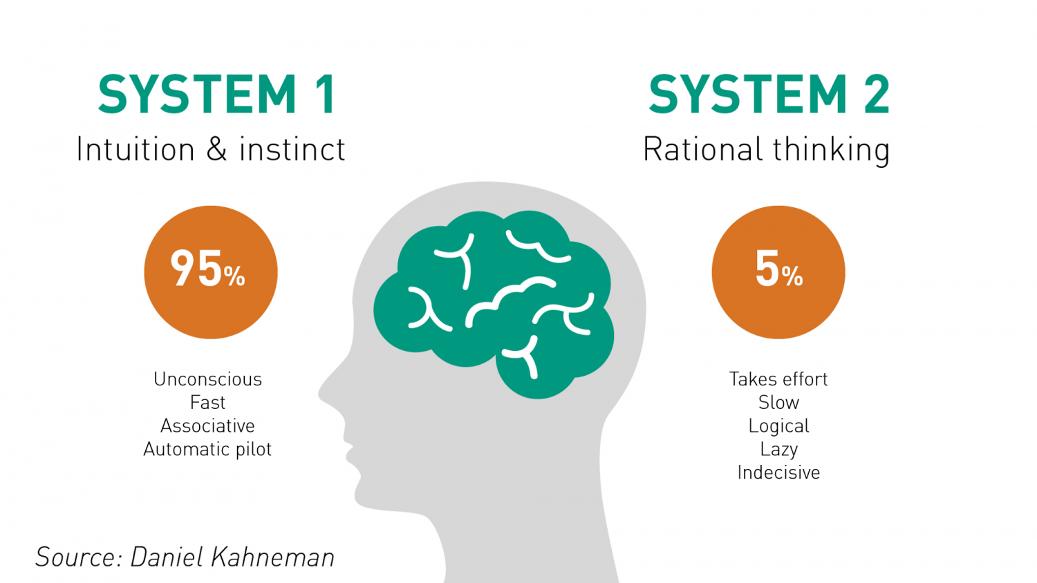 인간의 인지과정에 관한 ‘이중과정이론’에 의하면 사람의 뇌는 자동적이고 빠른 ‘시스템 1’과 의식적이고 느린 ‘시스템 2’라는 두가지 모드로 사고를 처리한다고 한다. 시스템 1모드는 직관적이고 생각해야 하는 노력이 거의 필요 없는 상황에서 작동하며, 뇌를 써야 하는 에너지를 아낄 수 있다. 그러나, 이 모드에는 편견의 문제와 잘못된 판단을 초래할 수 있는 휴리스틱의 문제가 있다. 반면, 시스템 2모드는 논리적이고 주의력을 필요로 하는 작업에 작동하지만, 처리시간이 오래 걸리고, 선택과 집중의 노력이 필요하며 게으르기도 하다.